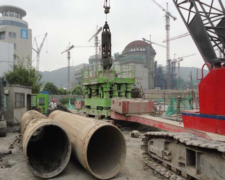1998—2012年我公司先后配合中核建設公司參與了秦山核電站及擴建工程的施工,圖為采用R.T—200AⅢ型全套管液壓回轉鉆機——新工藝完成了秦山核電站方家山核電站的深基坑圍護處理施工任務。